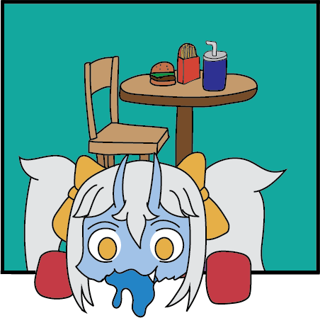 In this version, she is eating the bottom of the border because she’s hungry and prefers not to eat a lot of fast food.